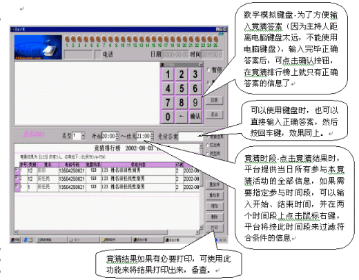 竟猜前必須對(duì)聽眾廣播,為了竟猜的準(zhǔn)確性,希望發(fā)送信息時(shí),必須把竟猜結(jié)果發(fā)送在前面, 如(12345姓名李立),否則,系統(tǒng)將不能識(shí)別其答案。竟猜結(jié)束時(shí),只要點(diǎn)擊竟猜結(jié)果選項(xiàng),系統(tǒng)會(huì)自動(dòng)將所有參與本節(jié)目的竟猜結(jié)果統(tǒng)計(jì)出來(lái)(此時(shí)沒有限制時(shí)間段),如果需要限制時(shí)間段,則應(yīng)在"開始"、"結(jié)束"時(shí)間段中輸入開始和結(jié)束的時(shí)間,并在其中任何一個(gè)時(shí)間段上點(diǎn)擊鼠標(biāo)右鍵,系統(tǒng)將會(huì)自動(dòng)過濾出符合條件的信息。