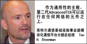 “目前我們是業(yè)內第一家推出第二代AdvancedTCA產(chǎn)品的廠家”,英特爾通信基礎設施事業(yè)部模塊化通信平臺分部(MCPD)總經(jīng)理Ton