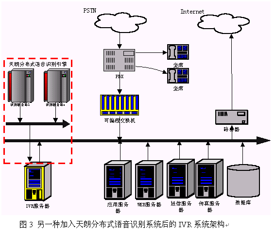 隨著語(yǔ)音識(shí)別的實(shí)用化進(jìn)程加快,人們?cè)絹?lái)越認(rèn)識(shí)到采用語(yǔ)音識(shí)別技術(shù)有利于極大的提高傳統(tǒng)按鍵方式IVR界面的友好性,提高服務(wù)的質(zhì)量。另外,采用語(yǔ)音識(shí)別技術(shù)可以把以前不可能實(shí)現(xiàn)的事情變得可行。因此,目前IVR行業(yè)越來(lái)越多的人認(rèn)識(shí)到語(yǔ)音識(shí)別技術(shù)的重要性,一些先行者已把語(yǔ)音識(shí)別技術(shù)集成到他們的系統(tǒng)中。那么,一個(gè)IVR廠商如何把天朗分布式語(yǔ)音識(shí)別系統(tǒng)集成到他們的IVR中呢?