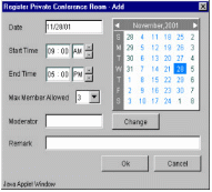 TeleConference系統(tǒng)內(nèi)的任一個(gè)分機(jī),都可以利用瀏覽器(Internet Browser)來(lái)預(yù)約會(huì)議時(shí)間,而參加會(huì)議的人可以在會(huì)議開(kāi)始時(shí),自動(dòng)打電話(huà)進(jìn)系統(tǒng)參加會(huì)議就像加入“聊天室“一樣簡(jiǎn)單。