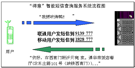 2004年4月15日和4月20日,擁有完全自主知識產(chǎn)權(quán)的語音與語言技術(shù)開發(fā)商和技術(shù)提供商北京得意音通技術(shù)有限責(zé)任公司(得意公司),在國際上率先把中文自然語言理解技術(shù)應(yīng)用在中國聯(lián)通和中國移動短信服務(wù)平臺上,結(jié)合《精品購物指南》報社權(quán)威、全面的信息資源,開通了北京地區(qū)餐飲領(lǐng)域智能短信查詢服務(wù)(簡稱智能短信),并將進一步支持互聯(lián)網(wǎng)平臺和WAP平臺,陸續(xù)開通更豐富和更實用的智能信息服務(wù)。
