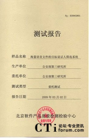 CTI論壇(ctiforum)06月25日消息: 2009年3月02-10日:北京軟件產(chǎn)品質(zhì)量檢測(cè)檢驗(yàn)中心對(duì)《海量語音文件的目標(biāo)說話人篩選系統(tǒng)》進(jìn)行了全面測(cè)試包括用戶文檔、功能性、可靠性、易用性、可維護(hù)性等多個(gè)特性。測(cè)試結(jié)果表明《海量語音文件的目標(biāo)說話 2009年3月02-10日,北京軟件產(chǎn)品質(zhì)量檢測(cè)檢驗(yàn)中心對(duì)《海量語音文件的目標(biāo)說話人篩選系統(tǒng)》進(jìn)行了全面人篩選系統(tǒng)》滿足軟件相關(guān)國家標(biāo)準(zhǔn)中的要求,系統(tǒng)在模擬測(cè)試環(huán)境中運(yùn)行正常、穩(wěn)定,正式通過北京軟件產(chǎn)品質(zhì)量檢測(cè)檢驗(yàn)中心的嚴(yán)格測(cè)試,系統(tǒng)的漏識(shí)率和誤警率分別達(dá)到了2.81%和 2.81%。