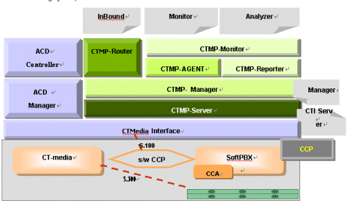 。。CTMP服務(wù)器由以下幾部分組成:通過CCP的接口實現(xiàn)電話系統(tǒng)與接線員之間連接的CTSE、對每個事件進(jìn)行分析的CCIS、將統(tǒng)計數(shù)據(jù)存儲進(jìn)入數(shù)據(jù)庫并實施檢索的CCID及CCDS、根據(jù)方案(Scenario)進(jìn)行智能化分配的CICR以及CMUX、CUGR、CCPM、CAPM等。