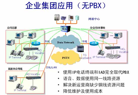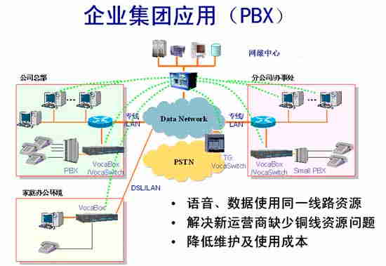 在總部、各個分公司、辦事處按照容量的大小可以安裝多臺VocaBox/IAD,并利用VocaBox自帶的FXO接口與本地PSTN網(wǎng)互通,在總部可用VocaSwitch的E1接口與PSTN互通。