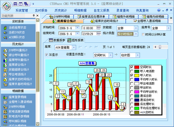座席綜合統(tǒng)計(jì):可以根據(jù)“月份”、“天”、“小時(shí)”來統(tǒng)計(jì)每一個(gè)座席的綜合指標(biāo)。統(tǒng)計(jì)的指標(biāo)包括:總登錄時(shí)長、空閑時(shí)長、呼入電話數(shù)、呼入時(shí)長、平均呼入時(shí)長、呼出電話數(shù)、呼出時(shí)長、平均呼出時(shí)長、通話總數(shù)、通話總時(shí)長、后處理時(shí)長、平均后處理時(shí)長、AUX總時(shí)長、電話振鈴時(shí)長、平均振鈴時(shí)長、轉(zhuǎn)移次數(shù)、磋商次數(shù)、保持次數(shù)、平均保持時(shí)長。