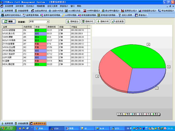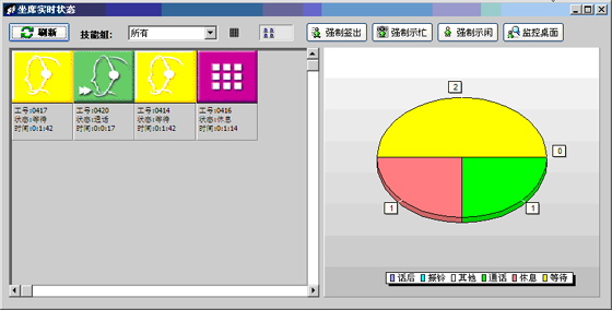 當(dāng)前座席狀態(tài):能夠提供座席的狀態(tài)表示,狀態(tài)持續(xù)時(shí)間,對(duì)應(yīng)的技能組,對(duì)應(yīng)的分機(jī)號(hào)碼,對(duì)應(yīng)的IP地址等信息?梢詫(duì)任何一個(gè)座席進(jìn)行強(qiáng)制簽出、強(qiáng)制示忙、強(qiáng)制示閑操作?梢詫(duì)任意座席進(jìn)行屏幕監(jiān)控操作(無需任何第三方軟件)。