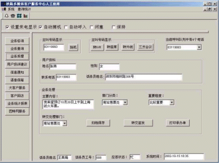 客戶服務(wù)中心系統(tǒng)將為鐵路局提供強(qiáng)勁的客戶關(guān)系管理能力,自動(dòng)業(yè)務(wù)導(dǎo)航能力,交互式協(xié)作能力,并可通過(guò)基于各業(yè)務(wù)代表技能特點(diǎn)的路由選擇,將客戶來(lái)話接到最符合要求的業(yè)務(wù)代表處,對(duì)于老客戶還可以建立一對(duì)一的關(guān)系,將老客戶的來(lái)話直接接到以前曾與之通過(guò)話的業(yè)務(wù)人員處,使其倍感親切。同時(shí),高度集中的客戶服務(wù)中心可以使鐵路部門(mén)用最低成本向旅客、貨主提供最有保證的服務(wù)和支持,不論在商機(jī)管理、客戶服務(wù)、還是顧客群維系等諸多方面,都是客戶服務(wù)中心發(fā)揮其巨大作用的領(lǐng)域。鐵路部門(mén)充分利用客戶服務(wù)中心的優(yōu)勢(shì),可以帶來(lái)無(wú)限商機(jī),通過(guò)電話回訪等手段,既能樹(shù)立良好的企業(yè)形象,又能提供完善的服務(wù)。這樣對(duì)增強(qiáng)客戶忠誠(chéng)度,保持原有的客戶群,降低顧客流失率和擴(kuò)大新的顧客群都將起到很好地作用。