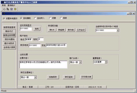 旅行社客戶服務中心系統(tǒng)將接入功能、導航功能、自動語音查詢功能、人工座席服務功能、話路轉接功能、信息資料處理緊密聯(lián)系起來。用戶撥打特服電話號碼后,可以根據(jù)需要選擇人工服務、自動語音查詢、自動留言,并能夠在幾種服務中來回切換或轉接其它電話;所記錄的資料可以分門別類的進行統(tǒng)計并形成報表,供相關部門進行檢索查閱;意見處理完畢,可由座席主動呼叫用戶,告知處理意見,形成閉環(huán)處理流程;從而打造全新的客戶服務形象。