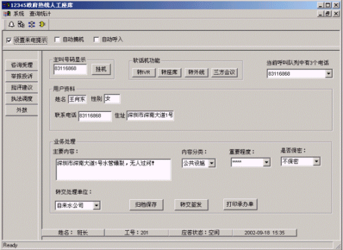 人民群眾打入電話后,可以選擇人工服務(wù),同座席話務(wù)人員直接溝通,由話務(wù)人員將群眾反映的問題和提出的建議意見記錄下來,將相關(guān)數(shù)據(jù)添加入系統(tǒng)數(shù)據(jù)庫;也可以在數(shù)據(jù)庫的支持下回答居民對城市建設(shè)和政策法規(guī)的咨詢和疑問。居民也可以選擇自動語音服務(wù)方式,根據(jù)系統(tǒng)的語音提示輸入按鍵,選擇類別,將自己的投訴和建議以及自己的聯(lián)系方式信息以留言錄音的方式保存在系統(tǒng)中。系統(tǒng)同時還支持自動傳真方式,市民可以通過傳真機(jī)打通市長(縣長)熱線,將自己的意見建議等內(nèi)容傳真給系統(tǒng),系統(tǒng)自動接收并存入數(shù)據(jù)庫。