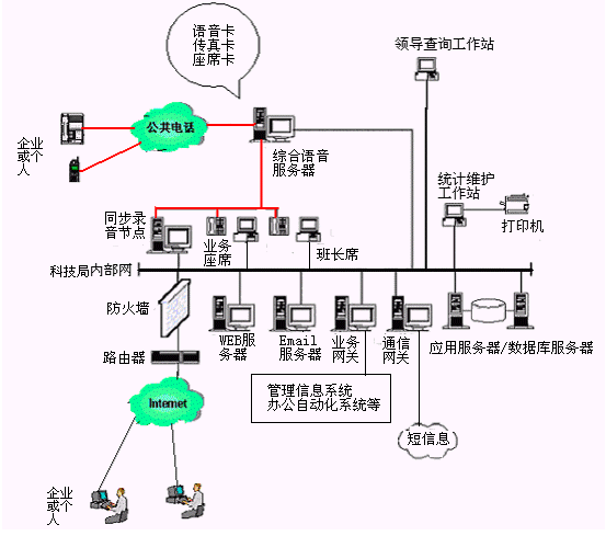 該系統(tǒng)的設(shè)計(jì)采用先進(jìn)的三層CLIENT/SERVER網(wǎng)絡(luò)體系結(jié)構(gòu),集目前先進(jìn)的計(jì)算機(jī)技術(shù)、通信技術(shù)、計(jì)算機(jī)電信集成(CTI)技術(shù)、多媒體呼叫接入技術(shù)、智能接入交換分配技術(shù)、數(shù)字語(yǔ)音處理技術(shù)、異構(gòu)系統(tǒng)信息交互技術(shù)、INTERNET網(wǎng)絡(luò)技術(shù)、安全容錯(cuò)技術(shù)、網(wǎng)絡(luò)組網(wǎng)技術(shù)等于一體,并與地方科技局已有技術(shù)支持系統(tǒng)(如MIS系統(tǒng)、辦公自動(dòng)化系統(tǒng)等)緊密結(jié)合在一起,突破時(shí)空的限制,通過(guò)人工座席、自動(dòng)語(yǔ)音/傳真、科技局相關(guān)人員等為企業(yè)或個(gè)人提供電話(huà)、傳真、電子郵件、因特網(wǎng)、手機(jī)、網(wǎng)絡(luò)電話(huà)等多種服務(wù)形式的周到、快捷、全方位的服務(wù),為企業(yè)或個(gè)人與地方科技局之間架起一座密切聯(lián)系的橋梁。