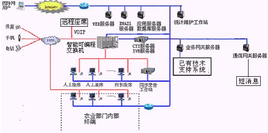 客戶利用電話、傳真、手機(jī)等撥打統(tǒng)一的特服號碼(如800XXX或9XXXX)或因特網(wǎng)進(jìn)入農(nóng)業(yè)分布式呼叫中心,本系統(tǒng)依托農(nóng)業(yè)部門各類計(jì)算機(jī)業(yè)務(wù)技術(shù)支持系統(tǒng)和網(wǎng)絡(luò)系統(tǒng),實(shí)現(xiàn)與農(nóng)業(yè)部門原有管理系統(tǒng)/業(yè)務(wù)系統(tǒng)及數(shù)據(jù)庫的無縫連接,通過人工受理或自動語音服務(wù)等方式全天24小時不間斷地為客戶提供各種服務(wù)。