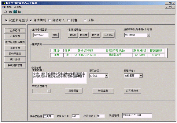 客戶打入電話后,當(dāng)系統(tǒng)的自動語音應(yīng)答子系統(tǒng)無法解決客戶問題時,客戶可選擇人工服務(wù),由客戶服務(wù)代表直接接聽客戶電話,處理并解決客戶問題。此時客戶同座席話務(wù)人員直接溝通,并同時記錄下該客戶的聯(lián)系方式,將相關(guān)數(shù)據(jù)添加入系統(tǒng)數(shù)據(jù)庫;也可以在數(shù)據(jù)庫的支持下處理傳真業(yè)務(wù),電子郵件,計(jì)算機(jī)文件傳輸、滿意度調(diào)查等。