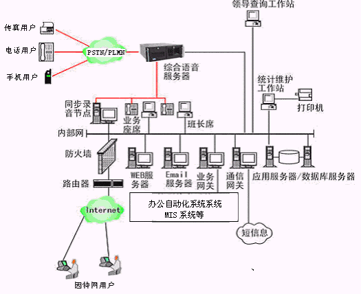 一期工程的語音接入設(shè)備:未定,提供排隊交換機(jī)方式,語音板卡方式,智能型可編程交換機(jī)方式,以便供選擇。建議采用智能型可編程交換機(jī)方式。