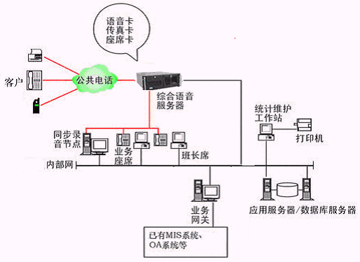 本系統(tǒng)物理結(jié)構(gòu)由帶語(yǔ)音板卡的高性能工控機(jī)(稱為綜合語(yǔ)音服務(wù)器,在功能上可以分為CTI服務(wù)器、IVR(交互式語(yǔ)音應(yīng)答)/IFR服務(wù)器、統(tǒng)計(jì)維護(hù)管理工作站、數(shù)據(jù)庫(kù)/應(yīng)用服務(wù)器、錄音留言工作站、業(yè)務(wù)網(wǎng)關(guān)服務(wù)器、業(yè)務(wù)代表座席、網(wǎng)絡(luò)系統(tǒng)等和應(yīng)用軟件構(gòu)成。