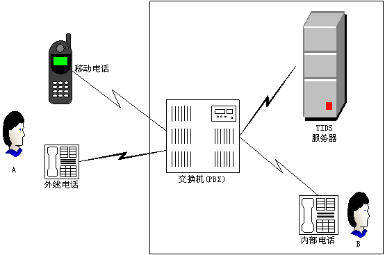 如圖1所示,在一個(gè)典型的應(yīng)用環(huán)境里,TIDS系統(tǒng)可與公司或單位的電話交換機(jī)通過一條或若干條模擬電話線相連。未來TIDS的版本將可支持E1/T1數(shù)字中繼線?梢詫IDS設(shè)置為缺省的電腦話務(wù)員,即用戶呼叫直接由TIDS系統(tǒng)處理;也可以分配一個(gè)分機(jī)號(hào)碼給TIDS,當(dāng)用戶需要時(shí)可撥該號(hào)碼使用TIDS服務(wù)。在后一種情況下,最好是在交換系統(tǒng)的問候語中提示用戶如何撥打TIDS系統(tǒng)。
