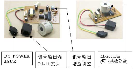 | 電氣特性 | MIC:電容式麥克風(fēng) MIC靈敏度:-63 dbm 輸出阻抗:10KΩ 輸出接頭:RJ-11 放大增益:0 ~ 10倍 電源:DC 12V;2.5 mA 電源接頭:DC Power Jack |