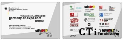 CTI論壇(ctiforum)5月17日消息(記者 潘婷婷):2010年5月,世人矚目的上海世博會已經隆重開幕,德國館是其中的大熱門之一。想一睹德國館的風采,一般都需要排2~3個小時的長隊。而觀眾可能不知道除了德國國家館外,德國還有多個城市在浦西的城市最佳實踐區(qū)展出。為了讓觀眾更好、更全面地體驗德國參展的所有活動,德國駐上?傤I事館聯(lián)手智能卡領域的專家捷德公司共同推出了德國館智能參觀卡,觀眾只需持卡參觀德國的其他相關展區(qū)后,就可以不用排隊進入德國國家館了。