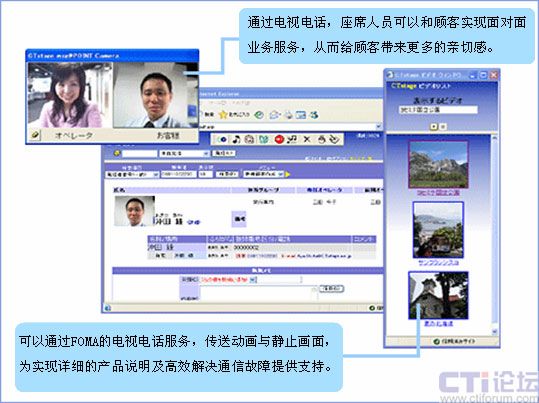 通過“FOMA”的電視電話服務(wù),可以實現(xiàn)面對用戶的表情進行服務(wù)。而且,例如,可以實時把握故障發(fā)生地點等只用語言無法準確傳遞的信息。進而,客服人員可以通過FOMA的電視電話功能送出動畫、靜止畫面,利用這些畫面說明情況。通過靈活運用這些功能,為實現(xiàn)顧客和企業(yè)之間的熱情友好、高效細致的通信提供支持。