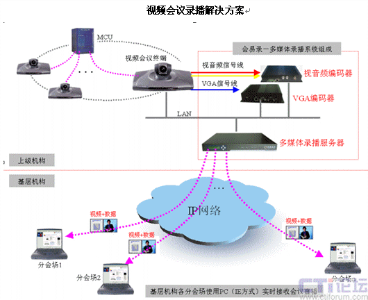 如圖所示,上級(jí)機(jī)構(gòu)視音頻編碼器接在視音頻源上,對(duì)視音頻信號(hào)采集,VGA編碼器采集VGA信號(hào),通過(guò)網(wǎng)絡(luò)傳給放在機(jī)房的多媒體錄播服務(wù)器。基層機(jī)構(gòu)的各個(gè)分會(huì)場(chǎng)通過(guò)IE瀏覽器的方式接受會(huì)議直播。