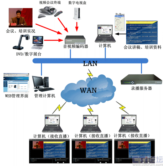 如上圖所示,會易錄采用前后臺分離模式,前臺設(shè)備(視音頻編碼器、數(shù)據(jù)編碼器)負責信號采集;后臺設(shè)備(多媒體錄播服務器)負責信號處理。前后臺設(shè)備之間通過IP網(wǎng)絡(luò)進行通訊。上述編碼器可將采集到的視音頻信號和計算機屏幕信號編碼后通過網(wǎng)絡(luò)發(fā)送到后臺的多媒體錄播服務器,多媒體錄播服務器可將收到的視音頻信號和計算機屏幕信號進行同步一體化的錄制、直播、點播。