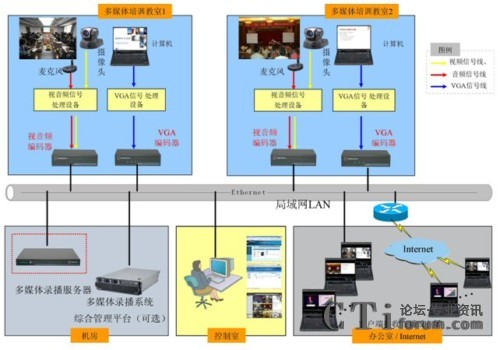 如上圖所示,銳取多媒體錄播成功實(shí)現(xiàn)了中國電力投資集團(tuán)高級培訓(xùn)中心兩間多媒體教室內(nèi)培訓(xùn)課程的錄制、直播和后期點(diǎn)播。銳取多媒體錄播前端的編碼器部署在多媒體教室,編碼器采集培訓(xùn)的PPT和老師講課的圖像聲音編碼后通過網(wǎng)絡(luò)傳送給機(jī)房的多媒體錄播服務(wù)器,多媒體錄播服務(wù)器實(shí)現(xiàn)培訓(xùn)過程中“教師學(xué)生圖像聲音+老師講稿(PPT)”的同步錄制、直播、點(diǎn)播。
