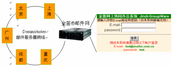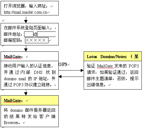 。1) 在不改變現(xiàn)有網(wǎng)絡硬件、軟件環(huán)境的情況下,添加一臺郵件網(wǎng)關服務器,通過統(tǒng)一的web登陸界面,輸入Email地址和密碼后,金笛?郵件網(wǎng)關會自動根據(jù)內(nèi)部DNS找到該用戶所在的Domino Mail Server, 并通過標準郵件協(xié)議POP3提取該用戶的郵件,以web頁面形式顯示在用戶屏幕上。