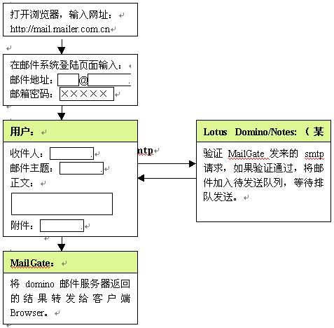 金笛郵件網(wǎng)關完全基于B/S架構(gòu)的設計,使得郵件收發(fā)、管理都是基于瀏覽器完成,客戶端只要打開IE瀏覽器即可,無需做任何設置,大大方便了用戶。也就是說,在城域網(wǎng)任一節(jié)點,都可以通過內(nèi)部域名(DNS)訪問郵件網(wǎng)關,然后通過郵件網(wǎng)關與用戶所在的domino郵件服務器通訊,將郵件主題、郵件內(nèi)容顯示在web頁面上。金笛?郵件網(wǎng)關的具體工作流程如下: