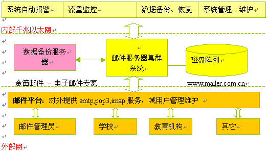 本項目采用金笛集群郵件系統(tǒng),通過兩臺IBM PC服務(wù)器實現(xiàn)高可用性。支持SMTP, POP3,IMAP等主流協(xié)議,支持WebMail,支持郵件列表等功能,同時要求兼容性好,與網(wǎng)站其他業(yè)務(wù)系統(tǒng)沒有沖突。