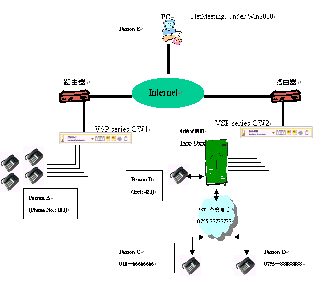 1、 兩臺(tái)語(yǔ)音網(wǎng)關(guān),分別為 GW1 和GW2,與另外一臺(tái)電腦同時(shí)連接在internet上。