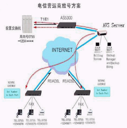 電信運(yùn)營(yíng)商放號(hào)方案采用寬帶數(shù)據(jù)網(wǎng)絡(luò)接入到運(yùn)營(yíng)商,IP電話數(shù)據(jù)流通過寬帶數(shù)據(jù)網(wǎng)絡(luò)接入運(yùn)營(yíng)商的局端網(wǎng)關(guān)設(shè)備,或者直接進(jìn)入IP電話網(wǎng)絡(luò)。與傳統(tǒng)的電話相比,電信運(yùn)營(yíng)商放號(hào)方案不需要太多的額外投資購(gòu)買硬件設(shè)備;只需在用戶端安裝NETONE語音網(wǎng)關(guān)或IP電話機(jī),話吧、網(wǎng)吧、企業(yè)網(wǎng)用戶、校園網(wǎng)用戶及個(gè)人用戶就可以在現(xiàn)有的網(wǎng)絡(luò)基礎(chǔ)上實(shí)現(xiàn)IP電話放號(hào)服務(wù)。