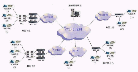深圳市蓋威科技有限公司完整的語音解決方案如下,用一個網(wǎng)管平臺(AVS SERVER)來管理眾多企業(yè),各企業(yè)分支機(jī)構(gòu)間可以實現(xiàn)相互通話免話費(fèi),另外將企業(yè)內(nèi)部通話之外的電話通過網(wǎng)管平臺接入到電信營運(yùn)商的VoIP
