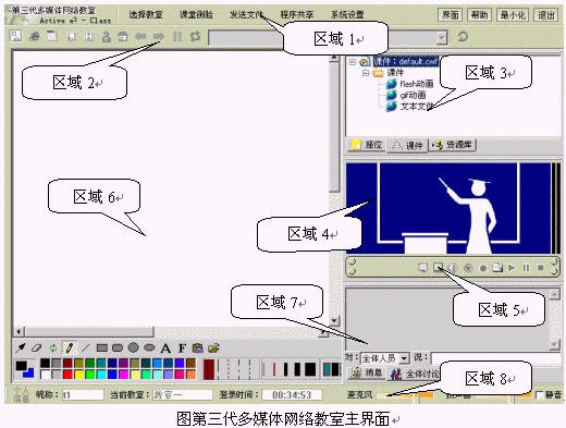 如圖所示,第三代多媒體網(wǎng)絡教室主界面主要包括以下幾個區(qū)域: