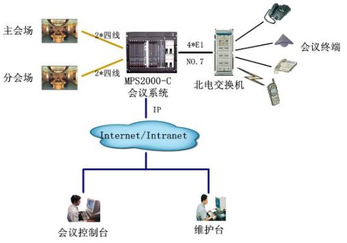 該會(huì)議系統(tǒng)通過4個(gè)數(shù)字中繼,與北電用戶交換機(jī)互連,采用七號(hào)信令。與視頻會(huì)議系統(tǒng)主會(huì)場采用四線音頻接口接主會(huì)場調(diào)音臺(tái),保證與視頻會(huì)議系統(tǒng)音頻的無縫對(duì)接。通過以太網(wǎng)口與局域網(wǎng)連接,實(shí)現(xiàn)維護(hù)管理及會(huì)議控制等功能。