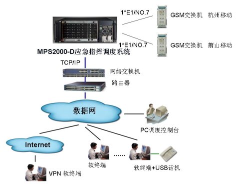 從上示組網(wǎng)圖中可以看到,整套MPS2000-D應(yīng)急指揮調(diào)度系統(tǒng)利用了移動網(wǎng)管中心的數(shù)據(jù)網(wǎng)絡(luò)資源,通過SIP協(xié)議,在各個PC終端上通過軟終端的方式接入調(diào)度系統(tǒng),作為IP調(diào)度終端。平時可將該軟終端作為個人通訊助理終端,解決用戶的多種通信需求。并通過PC調(diào)度臺來對整套系統(tǒng)進行應(yīng)急調(diào)度控制。