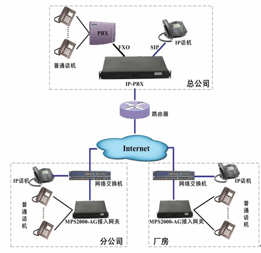 各分公司根據(jù)實(shí)際分機(jī)數(shù)配置相應(yīng)的接入網(wǎng)關(guān)或IP話機(jī)。接入網(wǎng)關(guān)和IP話機(jī)通過Internet注冊(cè)到位于總公司的IP-PBX上,實(shí)現(xiàn)了總部電話和分公司、廠房電話之間的通信、號(hào)碼直撥、來電顯示等功能。