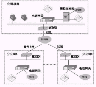 本方案采取IP語音接入的方法,利用88IP動態(tài)域名解析系統(tǒng),將IPMUX電話網(wǎng)關(guān)的網(wǎng)絡(luò)接口接入到公司和分部(分公司)的局域網(wǎng)中,通過ADSL、ISDN、撥號上網(wǎng)等方式,同連接在此因特網(wǎng)上的其它IPMUX電話網(wǎng)關(guān)相連,從而將不同地域的電話連接在一起,組成整個公司的IP電話網(wǎng),以達(dá)到免費(fèi)通話的目的。