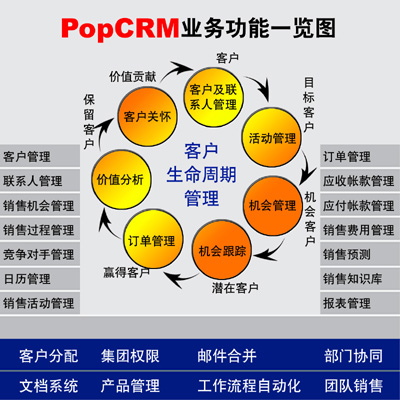 PopCRM吸收了國(guó)內(nèi)外先進(jìn)的管理思想,以客戶的需求為根本,以應(yīng)用價(jià)值為核心,聚焦銷售環(huán)節(jié),對(duì)客戶資源統(tǒng)一管理,規(guī)范銷售行為;對(duì)銷售進(jìn)行分析預(yù)測(cè),提供決策依據(jù);對(duì)客戶進(jìn)行全面分析,提供客戶關(guān)懷,吸引并留住客戶,全面提高企業(yè)的盈利能力。