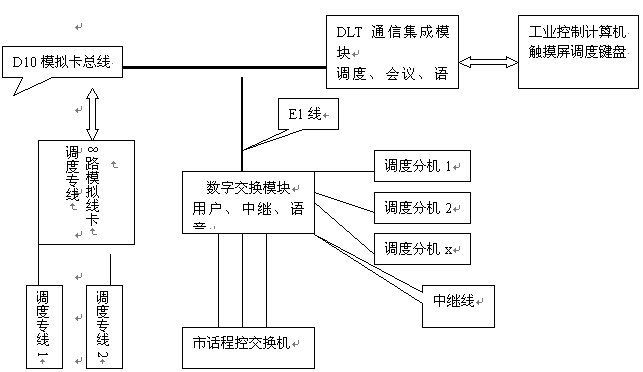 在DLT多路通通信系統(tǒng)平臺中,由于DLT通信集成模塊具有D10總線,可以和模擬環(huán)路用戶卡相連,實現(xiàn)直接用戶線功能,因而可克服上述兩種調(diào)度設(shè)備的不足,以滿足現(xiàn)代化生產(chǎn)的快速要求、廣域,智能化調(diào)度指揮要求。