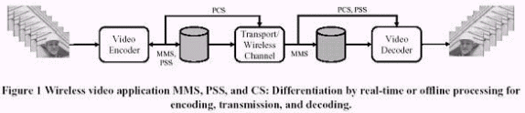 雖然新的服務(wù)如多媒體廣播/組播服務(wù)(MBMS)是未來無線網(wǎng)絡(luò)的發(fā)展計(jì)劃,但我們被約束成單一的應(yīng)用程序接受者。移動(dòng)手持設(shè)備受處理器速度和存儲(chǔ)容量的限制,因此,移動(dòng)視頻編碼的設(shè)計(jì)必須以最低復(fù)雜度和最高效率為目標(biāo)。正如其它文章所討論的復(fù)雜問題一樣,我們將自己約束在傳輸和工具上。以上三點(diǎn)定義的應(yīng)用可以在預(yù)定的的傳輸帶寬里面,最大限度地允許端到端的時(shí)延,在不同的系統(tǒng)結(jié)構(gòu)有不同的結(jié)果,一個(gè)簡單的圖示如圖一。