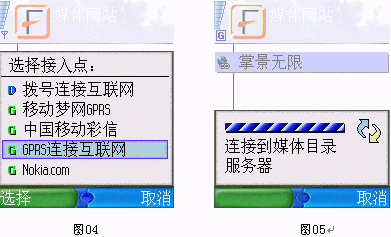選擇" GPRS 連接互聯(lián)網(wǎng)"后,開始通過 GPRS 連接媒體目錄服務(wù)器,見下圖所示 :(圖04、05)