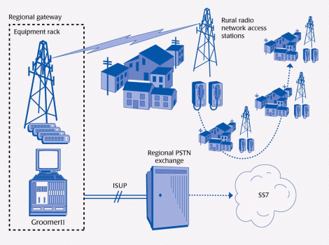 鄉(xiāng)村網(wǎng)絡(luò)方面,GroomerII通過EEMA協(xié)議與信道組合器相連,這樣即可與DaRT單元及廣播天線連接,進而從本地網(wǎng)絡(luò)的存取點傳輸和接收信號。目前,本系統(tǒng)共裝備了16臺GroomerII網(wǎng)關(guān),每一個都與本地交換機相連。這些網(wǎng)關(guān)通過信道組合器和提供多達15個DaRT單元的E&M電路連接,支持30線的PSTN訪問。