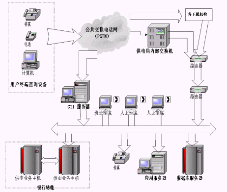 (3)自動(dòng)轉(zhuǎn)人工服務(wù)。系統(tǒng)還可自動(dòng)轉(zhuǎn)接人工坐席,由電力專業(yè)人員負(fù)責(zé)解答和處理客戶意見;蛘邔⒖蛻舴⻊(wù)中心系統(tǒng)與后臺(tái)數(shù)據(jù)庫服務(wù)器相接,通過客戶提供的相關(guān)信息,為客戶提供個(gè)性化的在線服務(wù)。