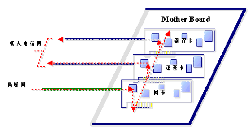 通過局域網(wǎng)傳遞語音數(shù)據(jù)本來就不能保證其時實時性,其結果就是用戶聽到的語音經(jīng)常斷續(xù),保證不了語音質量。如果傳遞的語音數(shù)據(jù)是經(jīng)過壓縮的,語音數(shù)據(jù)本來就是通過TTS進行合成的,再經(jīng)過壓縮,則音質會有很大的損傷,因此同樣保證不了語音質量。從上圖中我們可以看到,經(jīng)TTS合成的語音數(shù)據(jù)從局域網(wǎng)經(jīng)過網(wǎng)卡,再通過主板PCI(或ISA)總線進入語音卡,最后進入電信網(wǎng),同樣語音數(shù)據(jù)通過計算機主板經(jīng)PCI(或ISA)總線進入語音卡也要求是實時的。這兩種實時性的要求會導致在接入量比較大的情況下,會給計算機的總線造成很大的負擔。因為總線的帶寬(數(shù)據(jù)吞吐量)是有限的。況且其它的板卡和接口(如聲卡、顯示卡等)也要直接或間接地占用總線。因此在接入量比較大的情況下,計算機的總線帶寬會成為一個比較關鍵的瓶頸。即便提高語音板卡的接入能力。在有大量電話接入的情況下,由于語音數(shù)據(jù)實時性的要求,也不能保證語音質量。