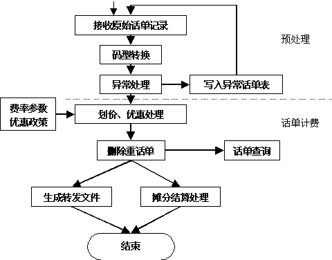 區(qū)域計(jì)費(fèi)中心從交換機(jī)實(shí)時(shí)/定時(shí)采集原始話單數(shù)據(jù),它是整個(gè)系統(tǒng)的起始點(diǎn),也是系統(tǒng)其它部分的基礎(chǔ)。其性能直接影響整個(gè)系統(tǒng)的運(yùn)行效果。對(duì)該模塊要求穩(wěn)定可靠、處理靈活。 “八國九制”意味著,一個(gè)好的計(jì)費(fèi)采集系統(tǒng),必然要求它能夠處理多種交換機(jī)格式。比如EWSD、S1240、5ESS等等。 在采集所用網(wǎng)絡(luò)傳輸協(xié)議上,一般要求系統(tǒng)支持X.25/FTAM、X.25/CMIP等協(xié)議。 2.計(jì)費(fèi)結(jié)算 采集機(jī)從交換機(jī)上采集下來原始話單文件,該類文件是BCD碼文件,需要進(jìn)行碼型轉(zhuǎn)換,變成ASCII碼文件,為后續(xù)的計(jì)費(fèi)處理創(chuàng)造條件。 話單格式轉(zhuǎn)換:話單格式轉(zhuǎn)換從交換機(jī)下載的二進(jìn)制信息中提取用于計(jì)費(fèi)和統(tǒng)計(jì)的信息,并從二進(jìn)制格式轉(zhuǎn)換為文本格式。但是由于上面提到的原因,國內(nèi)交換機(jī)種類比較多,各種交換機(jī)的數(shù)據(jù)格式都不相同,即使是相同的交換機(jī),由于需要版本升級(jí),也會(huì)對(duì)數(shù)據(jù)格式產(chǎn)生影響。假如預(yù)處理模塊不能靈活地處理各種格式的文件,則勢必會(huì)對(duì)電信服務(wù)商的投資造成浪費(fèi)。國創(chuàng)公司在話單預(yù)處理中,提供了一種“自定義話單格式”方式,用戶可以根據(jù)自己交換機(jī)的數(shù)據(jù)格式進(jìn)行配置,而預(yù)處理模塊不需進(jìn)行修改。即可以適應(yīng)當(dāng)前多種交換機(jī)并存的局面,又可以適應(yīng)未來交換機(jī)版本升級(jí)的需求,極大地保護(hù)了用戶的投資。 計(jì)費(fèi)劃價(jià)處理: 計(jì)費(fèi)計(jì)算模塊根據(jù)話單中記錄的起始時(shí)間、通話時(shí)長、對(duì)端號(hào)碼等信息在資費(fèi)策略庫中查找滿足條件的費(fèi)率極其優(yōu)惠策略。從而計(jì)算出此次通話應(yīng)向用戶收取的基本費(fèi)用。特別地,考慮到業(yè)務(wù)的發(fā)展與變化,系統(tǒng)可對(duì)費(fèi)用中的各項(xiàng)子費(fèi)用單獨(dú)計(jì)算,并能夠適應(yīng)新的優(yōu)惠策略的增加。整個(gè)計(jì)費(fèi)流程如下: