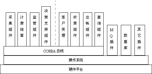 長途電話聯(lián)機(jī)計(jì)費(fèi)系統(tǒng) 長話計(jì)費(fèi)系統(tǒng)既包括計(jì)費(fèi)結(jié)算系統(tǒng),又包括營業(yè)服務(wù)系統(tǒng),功能比較多,數(shù)據(jù)處理流程也相對(duì)復(fù)雜。 簡單的傳統(tǒng)數(shù)據(jù)庫的機(jī)械化編程已很難滿足系統(tǒng)對(duì)大數(shù)據(jù)量的處理及靈活性等方面的要求,因此在這套系統(tǒng)中,我們采用了一些當(dāng)今業(yè)界的熱門技術(shù)。比如采用了CORBA軟總線思想和MQ Series消息管理隊(duì)列,也使之成為聯(lián)機(jī)計(jì)費(fèi)系統(tǒng)平臺(tái)的一次成功實(shí)施。其系統(tǒng)層次結(jié)構(gòu)圖如下: