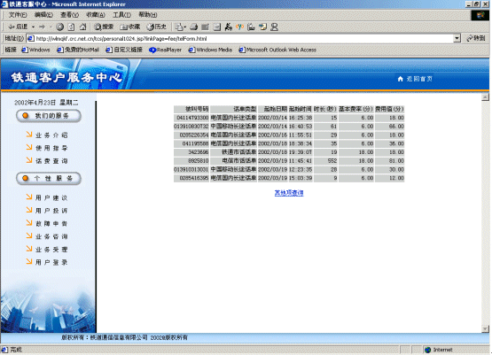 - 實時清單查詢:包括主叫號碼、主叫位置、被叫號碼、主叫開始時間、時長、費(fèi)率、總金額、賬戶余額/欠費(fèi)查詢,包括用戶名、賬號/卡號、余額/欠費(fèi)金額。