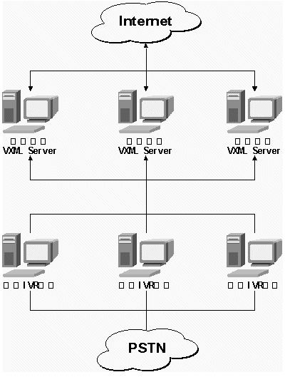 在數(shù)據(jù)中心設(shè)置VXML服務(wù)器,提供訪問互聯(lián)網(wǎng)絡(luò)的接口,地市臺(tái)與中心服務(wù)器使用標(biāo)準(zhǔn)的基于應(yīng)用層的協(xié)議通訊。地市臺(tái)與數(shù)據(jù)中心交換網(wǎng)頁(yè)和其他數(shù)據(jù),這種交換是實(shí)時(shí)的。各地市的電話用戶就能利用運(yùn)營(yíng)商提供本地電話號(hào)碼訪問互聯(lián)網(wǎng)上的信息。