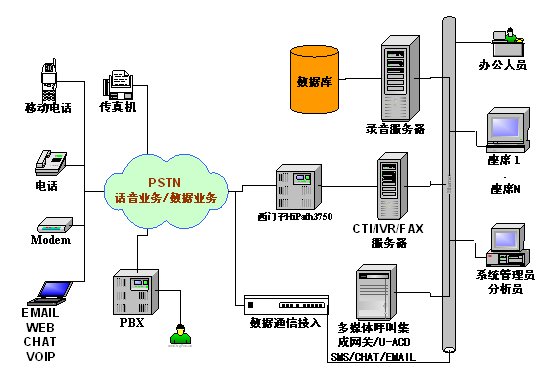 本方案采用西門子HiPath3750交換機(jī),通過強(qiáng)訊中間件控制整個(gè)呼叫中心的電話呼入、呼出。它支持多種聯(lián)絡(luò)渠道,包括語音、交互式自動(dòng)語音應(yīng)答(IVR)、傳真、短消息。