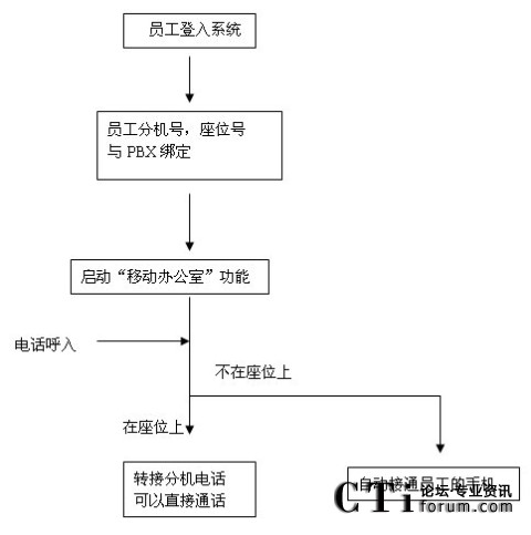 每個(gè)需要到企業(yè)辦公的員工,可以通過門禁系統(tǒng),或?qū)iT一臺PC上進(jìn)行登入,通過后由系統(tǒng)自動(dòng)分配或員工選擇一個(gè)空閑的座位,座位號與員工的分機(jī)號碼綁定,所有對這個(gè)員工分機(jī)的呼叫均被自動(dòng)轉(zhuǎn)移到其座位上的辦公電話上;