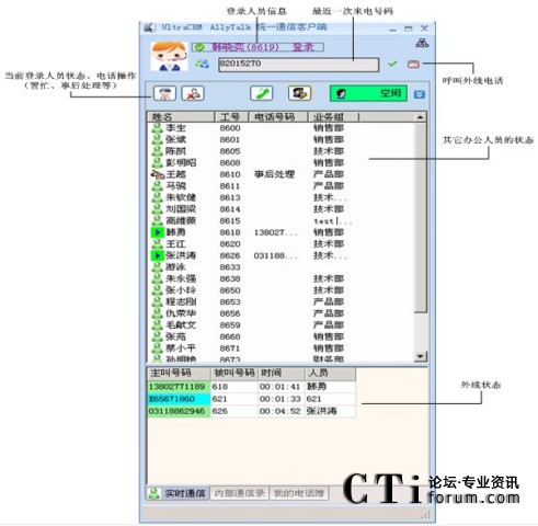 辦公人員可以通過時(shí)實(shí)電話的界面:實(shí)時(shí)監(jiān)控系統(tǒng)的呼叫隊(duì)列、其它辦公人員的工作狀態(tài);并且通過屏幕控制電話的接答、掛機(jī)、轉(zhuǎn)接,以及建立會(huì)議等操作。如下圖所示: